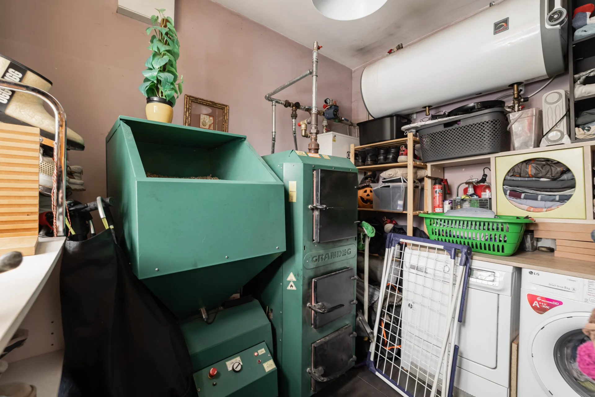 Pirmajā stāvā ir atsevišķa tehniskā telpa, kur atrodas apkures katls un boileris, kā arī veļas mazgājamā un žāvejamā mašīna.
