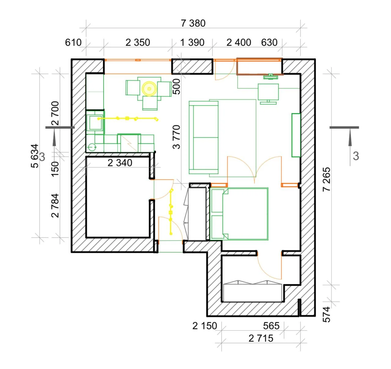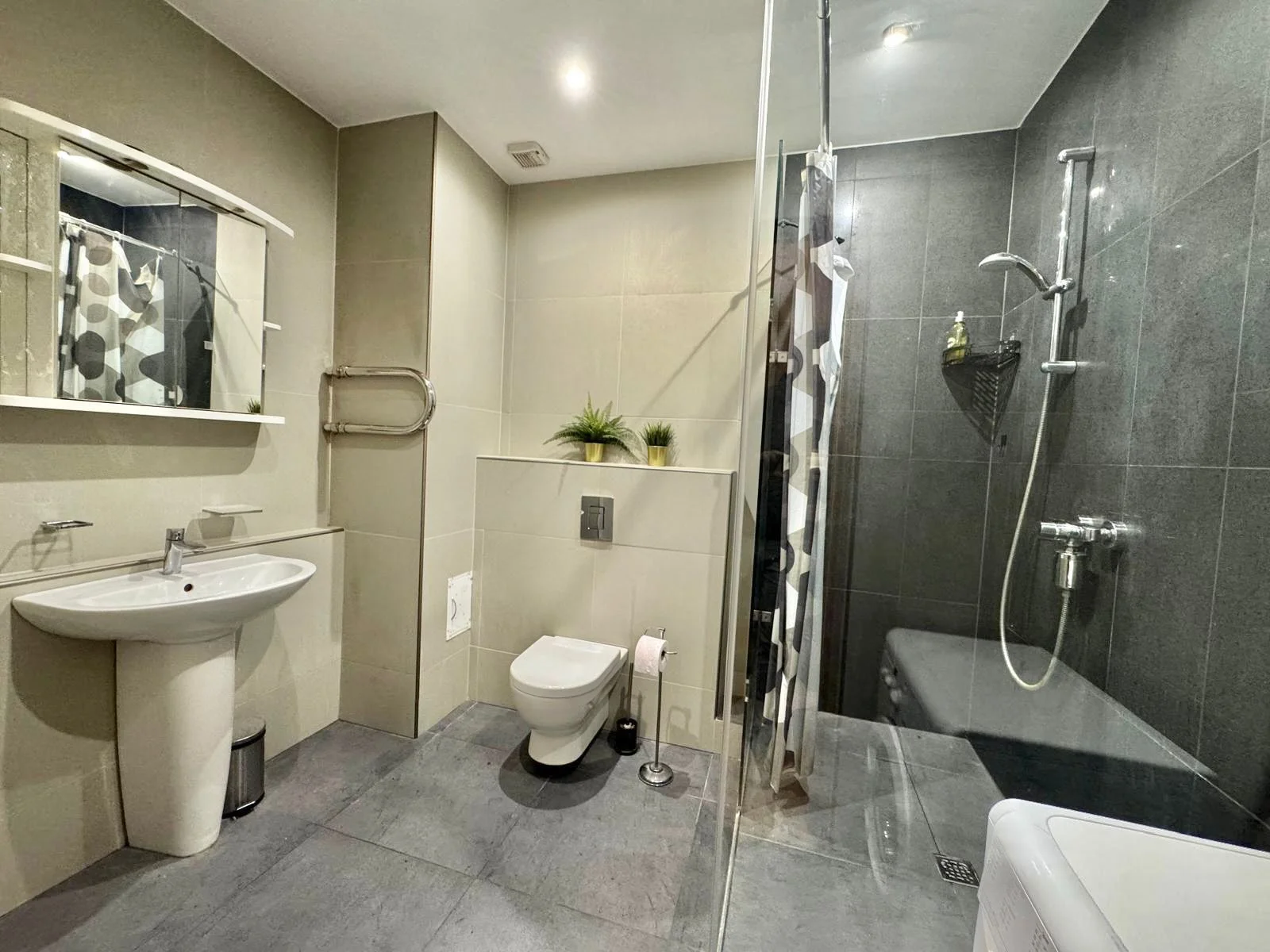 Plānojums šobrīd ir atvērta tipa studija, taču ir izstrādāts projekts pārplānošanai uz divistabu dzīvokli ar garderobi. Vannas istaba ir plaša un ērta, aprīkota ar apsildāmu grīdu un vietu glabāšanai.