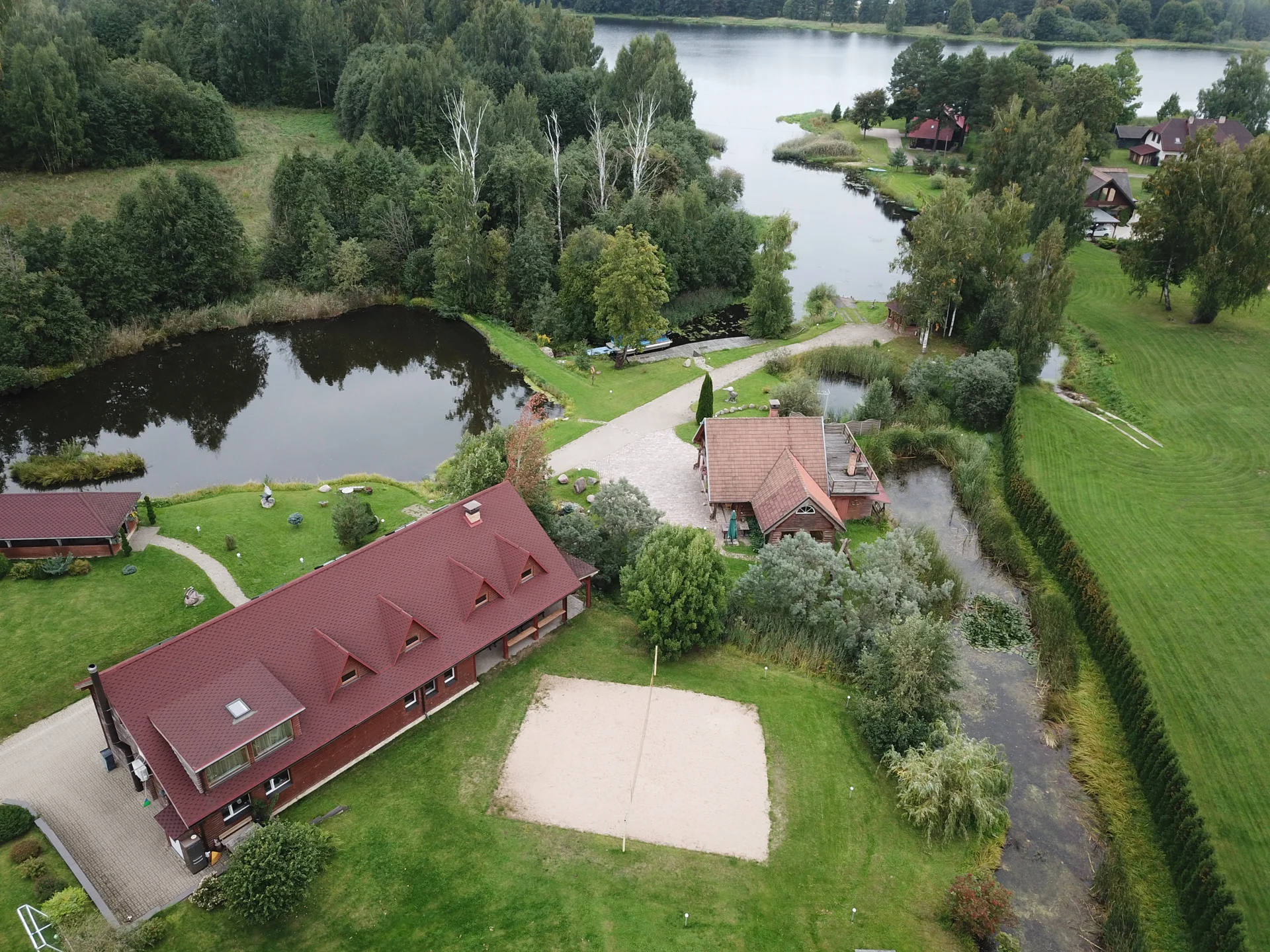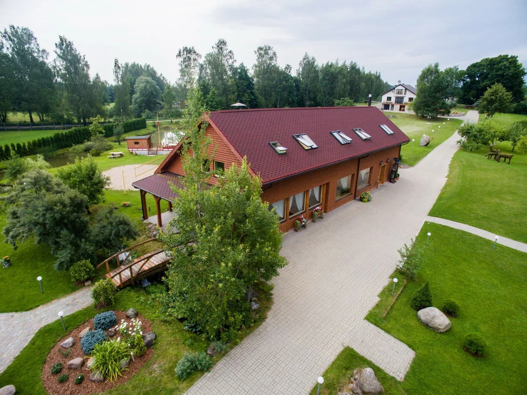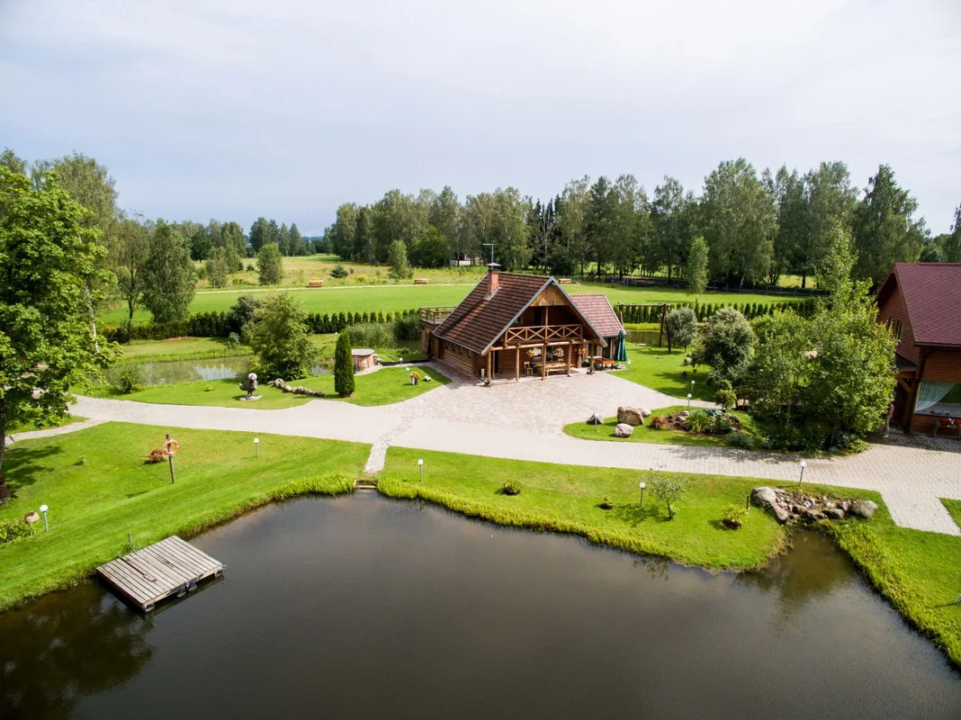 Blakus viesību namam gleznaina dīķa krastā ir āra nojume.