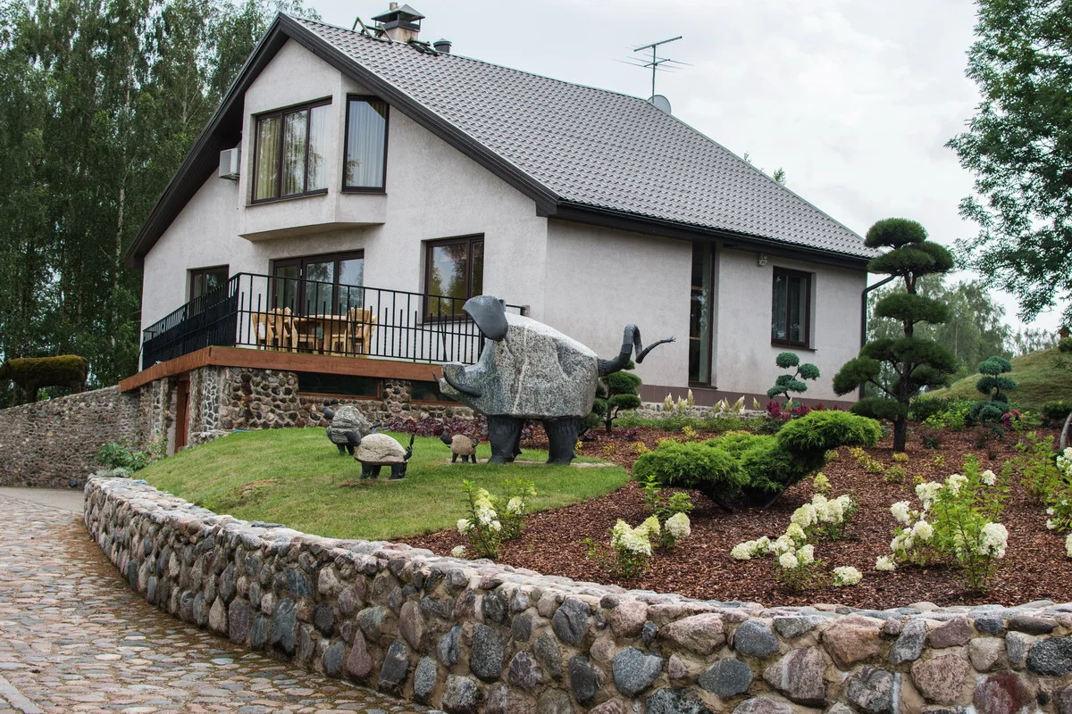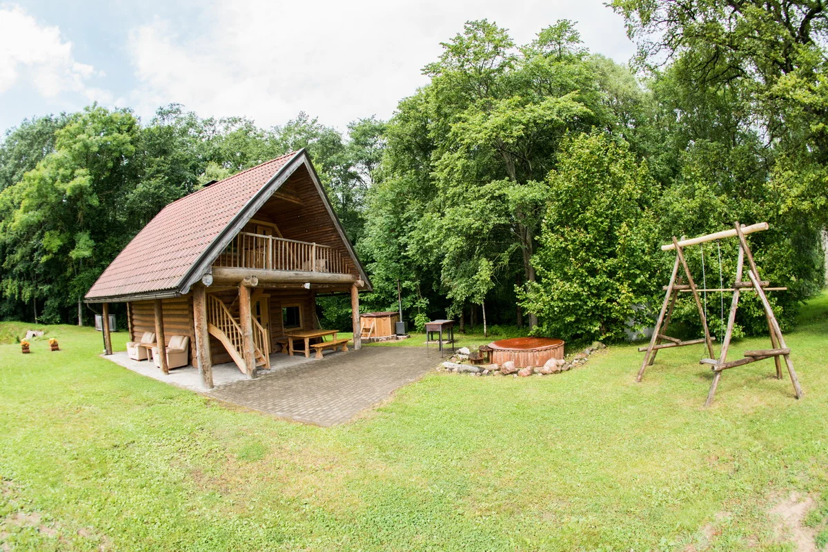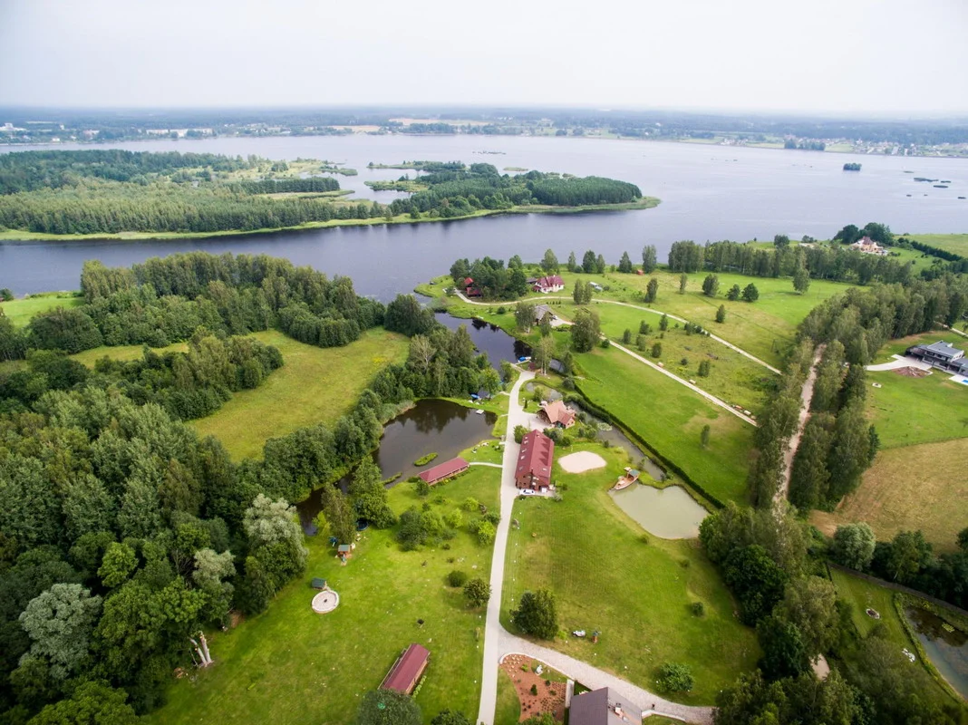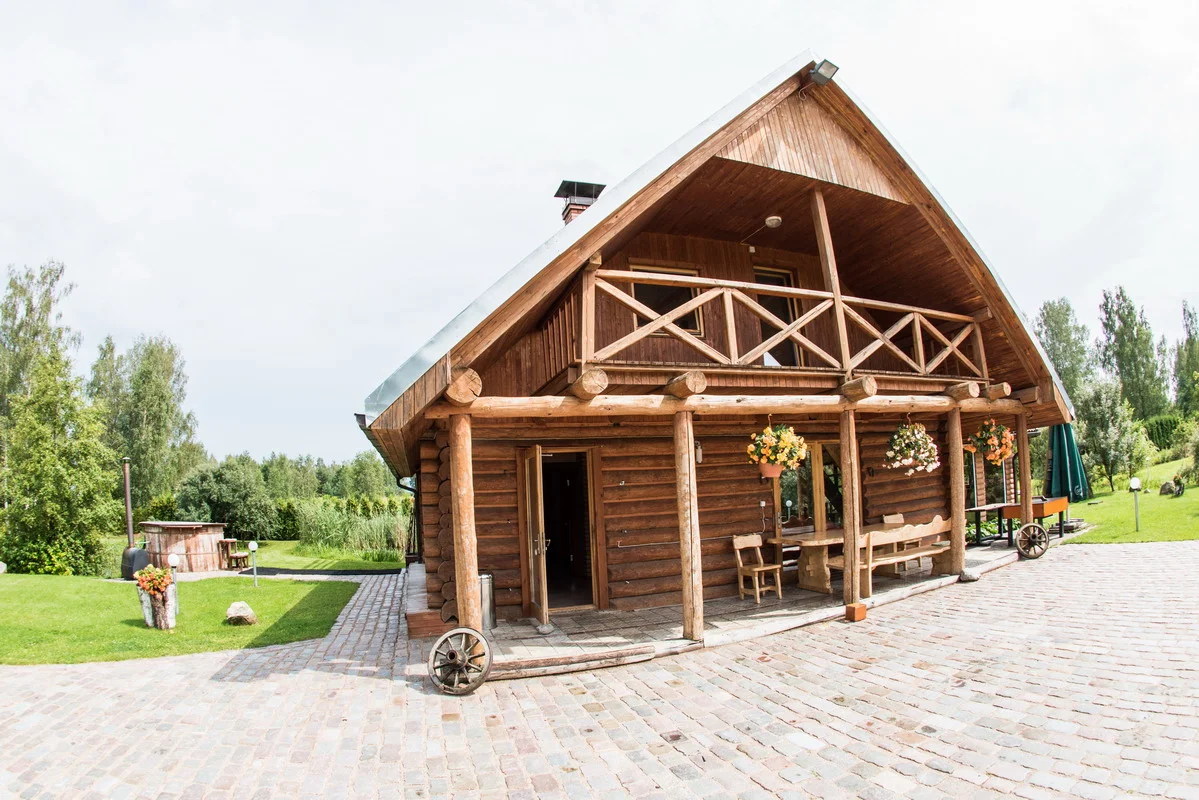 Blakus viesību namam gleznaina dīķa krastā ir āra nojume.