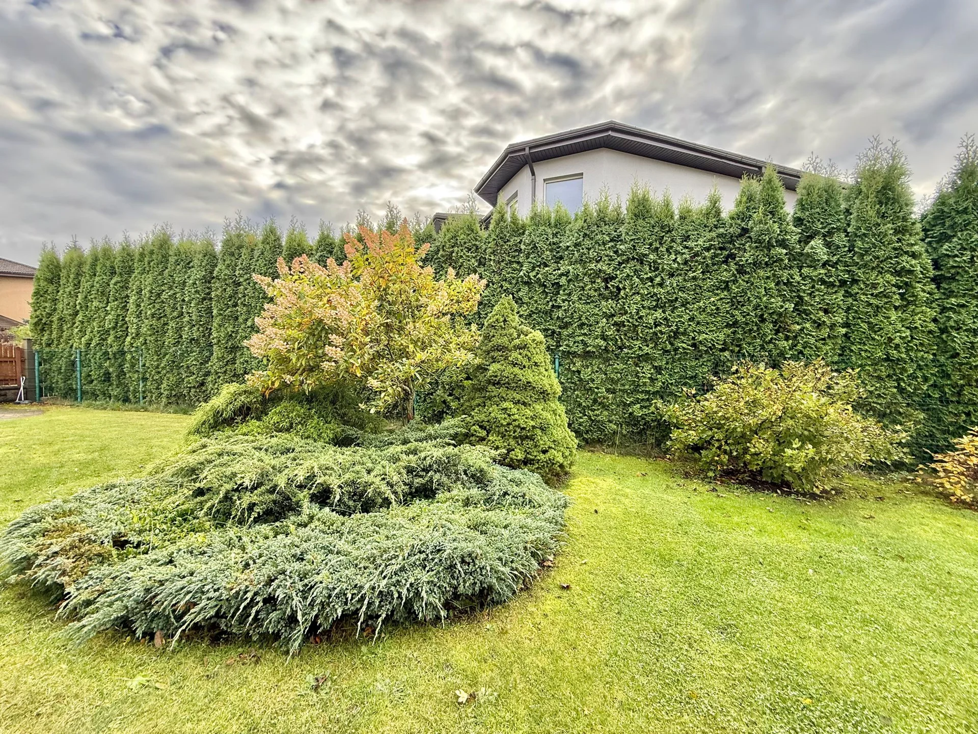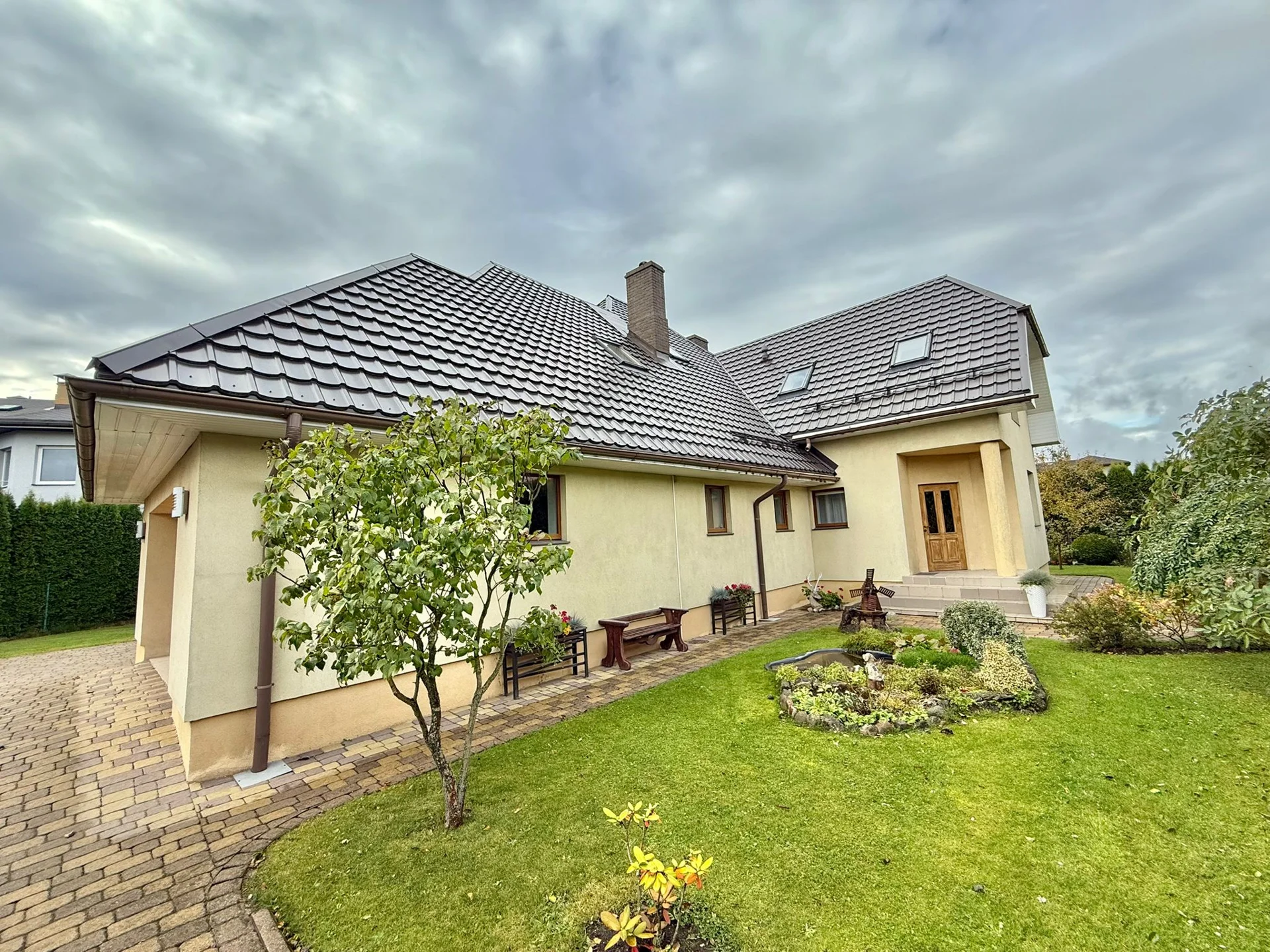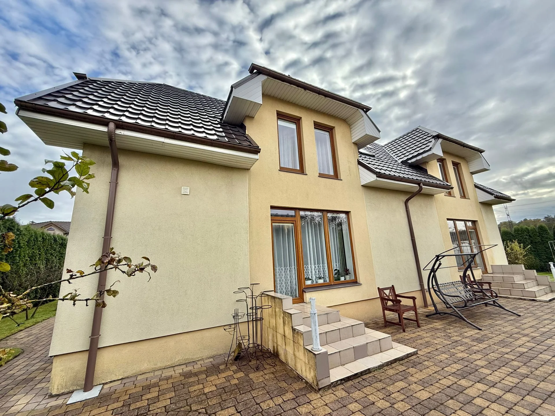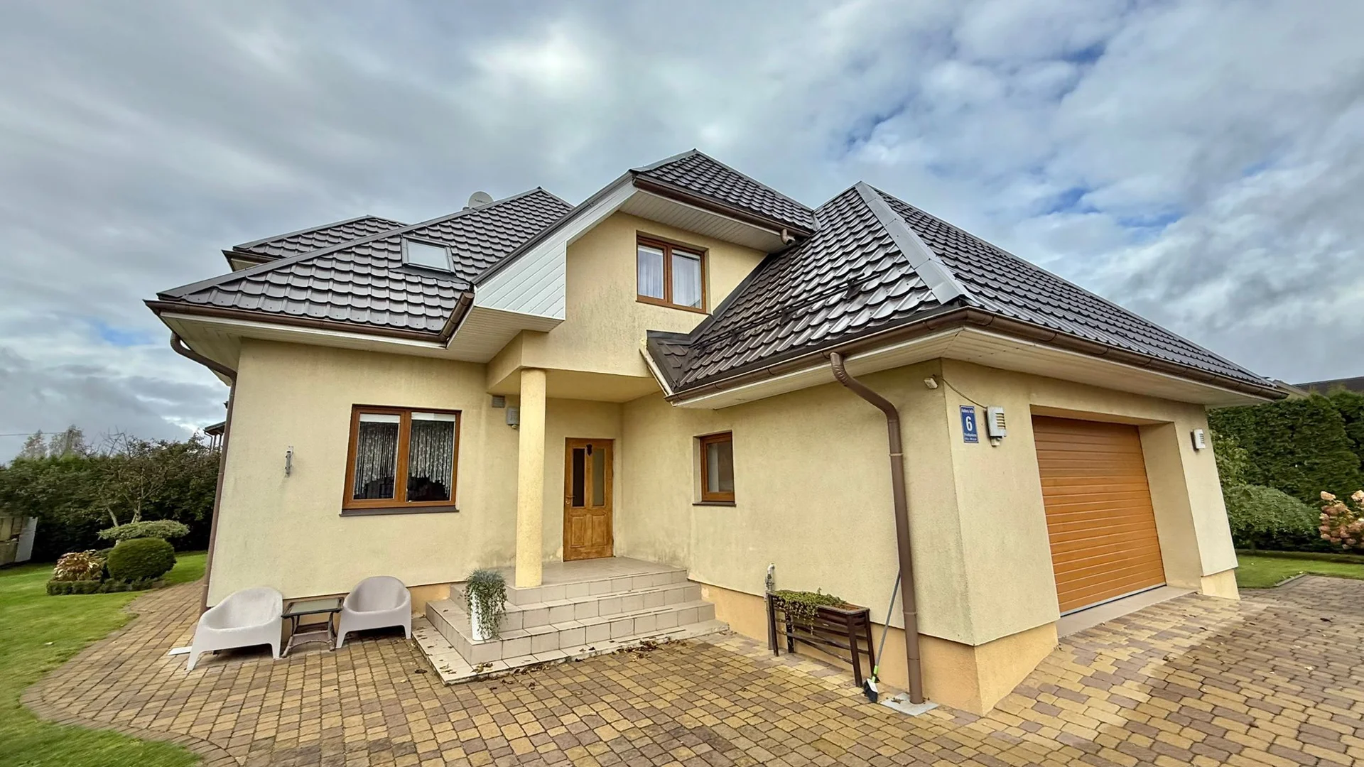 Ap māju ir plaša, labiekārtota teritorija ar bruģētiem celiņiem, dzīvžogu visapkārt un skaisti iekoptiem augiem, krūmiem un kokiem. Pagalmā atrodas siltumnīca ar dārzeņiem, augļu koki – ābeles, bumbieres, ķirši.